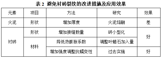 通过分析衬砖损毁机理,采取相应改进措施,见表2,并进行相应的应用效果评估。通过改进火泥及耐火砖参数来降低衬砖服役过程中产生的应力集中度。可以看出,由于火泥的耐用性不如耐火砖,因此增加火泥厚度达不到预期效果。减小耐火砖的尺寸后(砖长由150 mm减小为80 mm),火泥接缝数量增加。通过模拟计算承接高温铁水时砖缝增加前后砖中应力值对比可知,砖缝增加后,砖中最大主应力指数下降50%,最小主应力指数下降30%,应力分布更均匀,可有效避免砖中裂纹的产生。