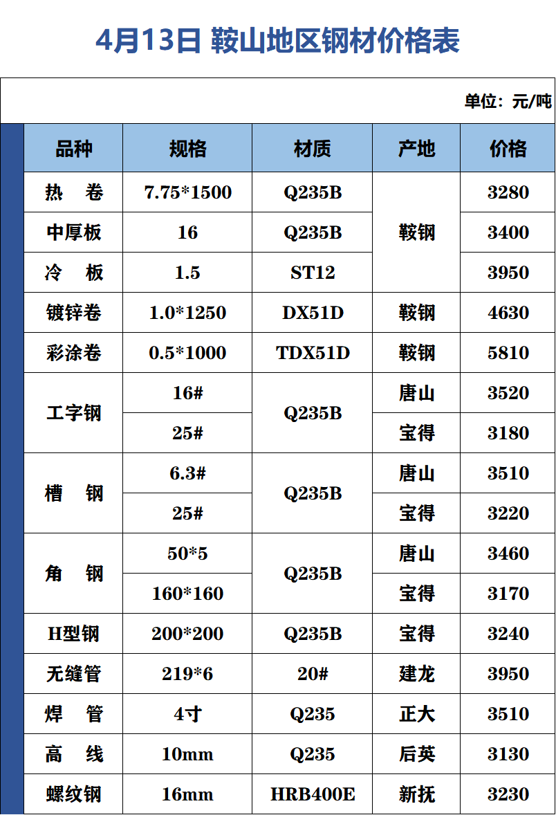 4月13日 鞍山地区钢材价格表