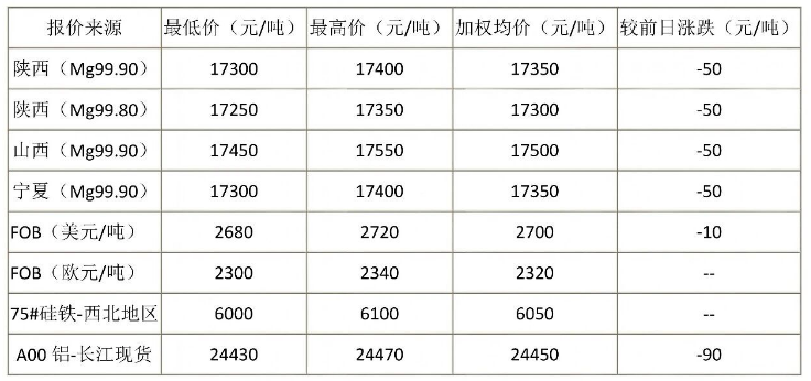 2. 原镁报价为按照报价企业产量加权计算后所得平均值,并按50元/吨取整;3. 表中价格均为现货含税、现金、不酸洗价,国内单位为元/吨;4. FOB为天津港离岸价格。