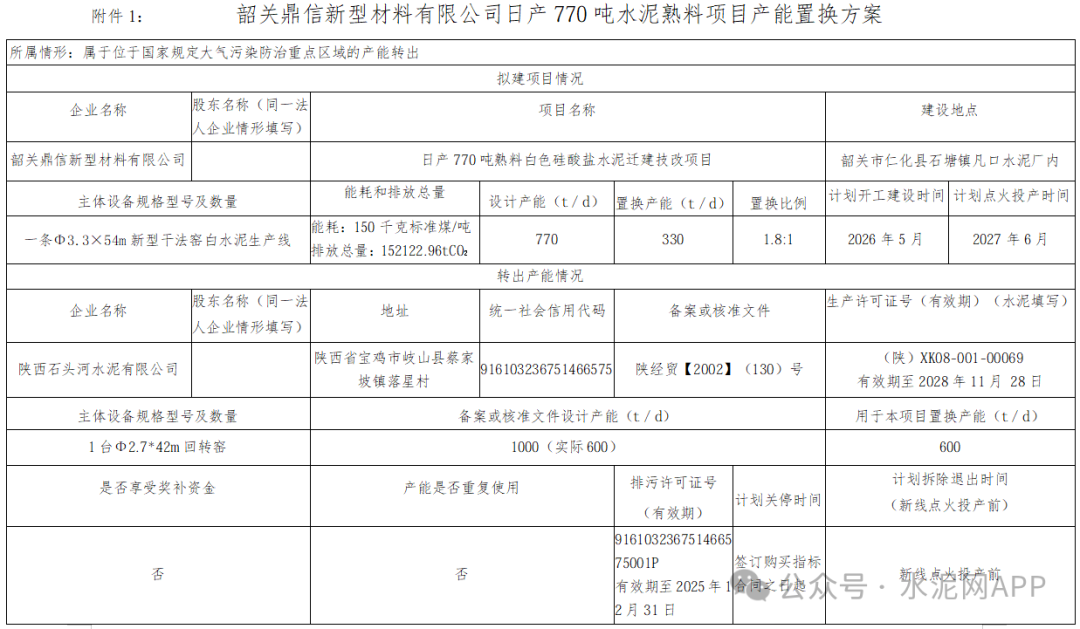 根据公示,韶关鼎信新型材料有限公司日产770吨熟料白色硅酸盐水泥迁建技改项目置换产能330t/d,置换比例为1.8:1,计划2026年5月开工,2027年6月点火投产。陕西石头河水泥有限公司一条600t/d熟料线用于本项目置换产能,该生产线计划新线点火投产前拆除退出。