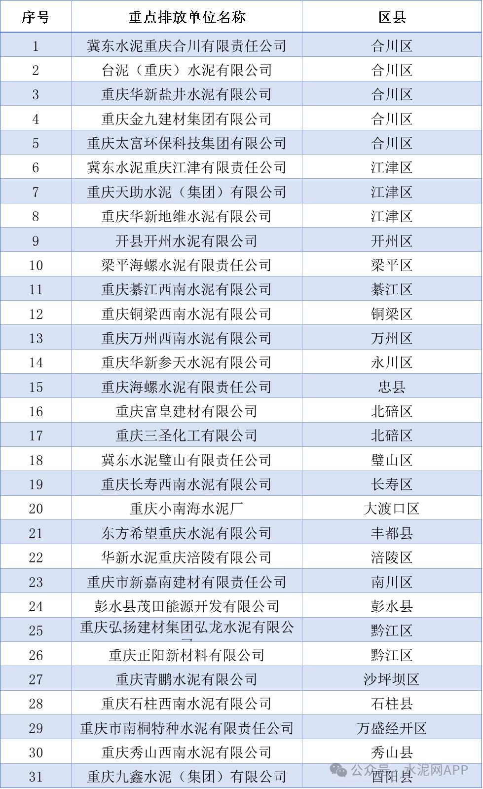 重庆市生态环境局9月23日发布《重庆市2023年度碳排放配额分配实施方案》(渝环办〔2024〕162号),根据《重庆市生态环境局关于调整重庆碳市场纳入标准的公告》(渝环〔2023〕55号),按年度温室气体排放量达到1.3万吨二氧化碳当量(综合能源消费量约5000吨标准煤)及以上的工业企业的纳入标准,对重庆碳市场原有名录进行更新,形成了重庆碳市场2023年度重点排放单位名录,共334家重点排放单位纳入2023年度配额管理。其中水泥制造行业名单如下: