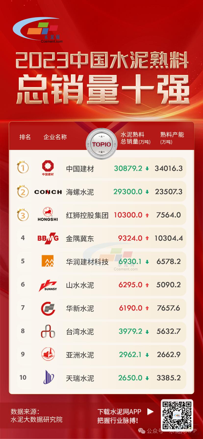 日前,中国水泥网发布2023年中国水泥熟料总销量TOP10排行榜。