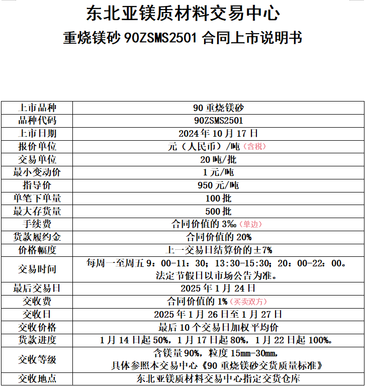 东北亚镁质材料交易中心 重烧镁砂90ZSMS2501 合同上市说明书