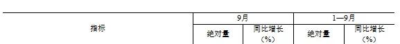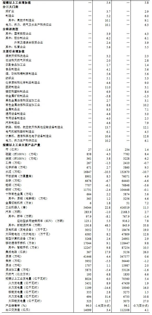 前三季度,全国规模以上工业增加值同比增长5.8%。分三大门类看,采矿业增加值同比增长2.9%,制造业增长6.0%,电力、热力、燃气及水生产和供应业增长6.3%。装备制造业增加值同比增长7.5%,高技术制造业增加值增长9.1%,增速分别快于全部规模以上工业1.7和3.3个百分点。分经济类型看,国有控股企业增加值同比增长4.3%;股份制企业增长6.1%,外商及港澳台投资企业增长3.9%;私营企业增长5.5%。分产品看,新能源汽车、集成电路、3D打印设备产品产量同比分别增长33.8%、26.0%、25.4%。9月份,规模以上工业增加值同比增长5.4%,比上月加快0.9个百分点;环比增长0.59%。9月份,制造业采购经理指数为49.8%,比上月上升0.7个百分点;企业生产经营活动预期指数为52.0%。1-8月份,全国规模以上工业企业实现利润总额46527亿元,同比增长0.5%。