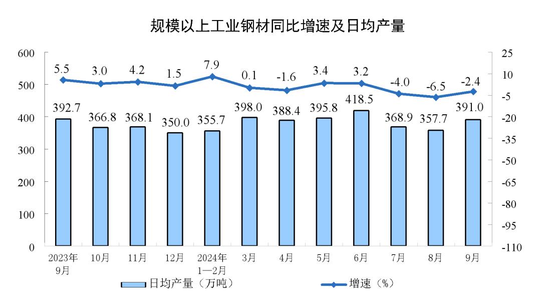 据国家统计局公布的数据,9月份,我国粗钢产量7707万吨,同比下降6.1%;生铁产量6676万吨,同比下降6.7%;钢材产量11731万吨,同比下降2.4%。