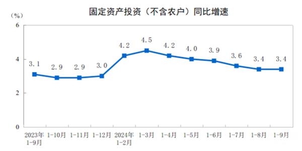 2024年前三季度,全国固定资产投资(不含农户)378978亿元,同比增长3.4%(按可比口径计算),其中,民间固定资产投资191001亿元,下降0.2%。从环比看,9月份固定资产投资(不含农户)增长0.65%。