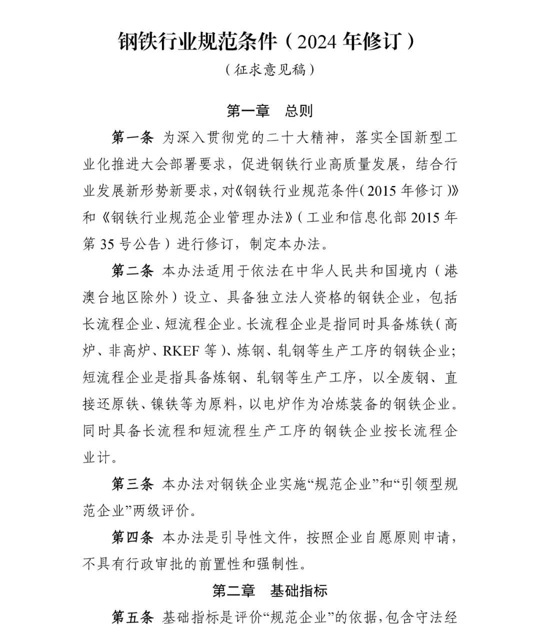 《钢铁行业规范条件(2024年修订)(征求意见稿)》向社会公开征求意见