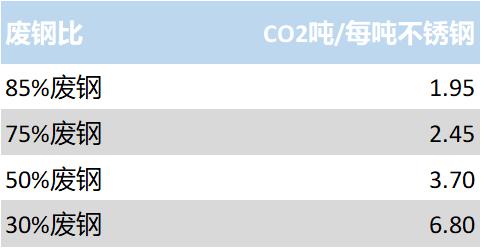 根据不同的废钢比,每生产1吨不锈钢产生的平均碳排放量如下。值得注意的是,总排放量包括范围1、范围2和范围3,被定义为“从摇篮到大门”生产总排放量。