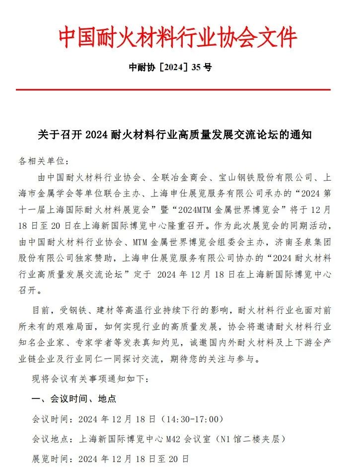中耐协:关于召开 2024 耐火材料行业高质量发展交流论坛的通知