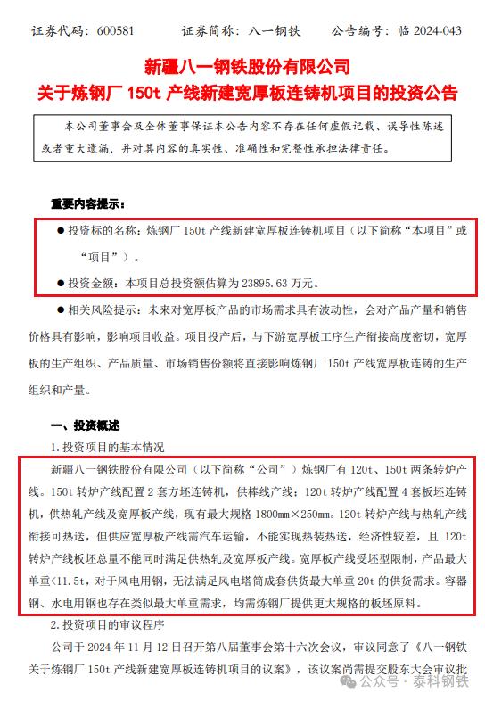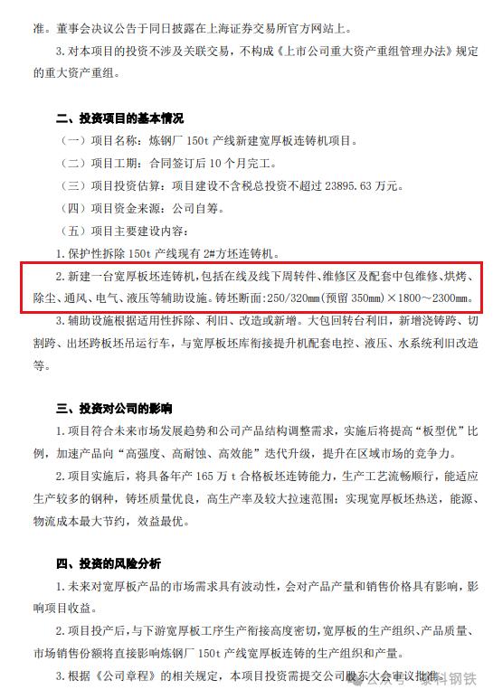 八一钢铁11月12日公告,公司拟投资不超过2.39亿元建设炼钢厂150t产线新建宽厚板连铸机项目,合同签订后10个月完工。建设内容包括保护性拆除150t产线现有2#方坯连铸机;新建一台宽厚板坯连铸机,包括在线及线下周转件、维修区及配套中包维修、烘烤、除尘、通风、电气、液压等辅助设施。