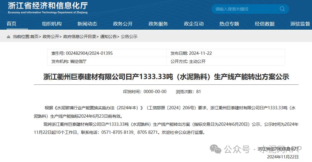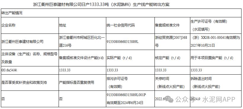 11月22日,浙江省经信厅发布“浙江衢州巨泰建材有限公司日产1333.33吨(水泥熟料)生产线产能转出方案公示”。