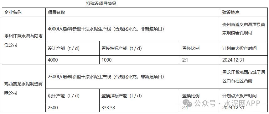 根据公示,浙江衢州巨泰建材1333.33t/d水泥熟料生产线产能转出,用于补充贵州江葛水泥4000t/d熟料生产线(置换补充1000t/d)、鸡西赛龙水泥2500t/d熟料生产线(置换补充333.33t/d)产能。