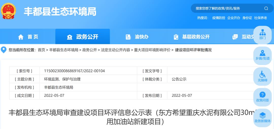 近日,重庆市丰都县生态环境局受理了东方希望重庆水泥有限公司骨料生产线改造项目建设项目环评信息。