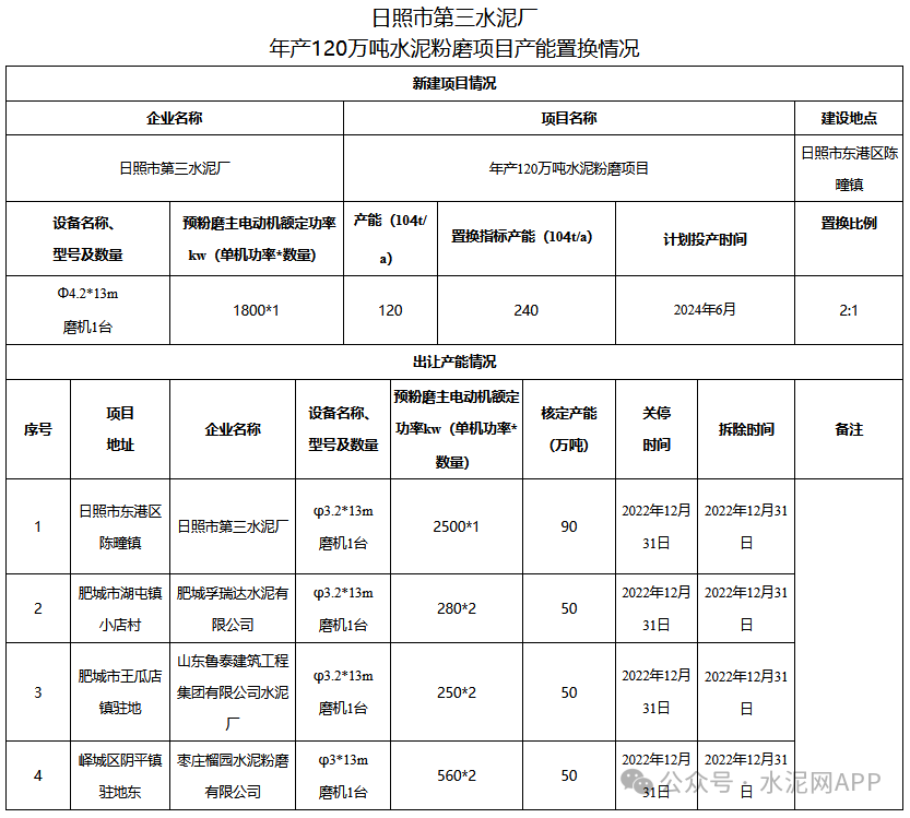 2022年8月8日公告的日照市第三水泥厂年产120万吨水泥粉磨项目,日照市第三水泥厂决定不再实施,现予以公告。原产能置换情况如下: