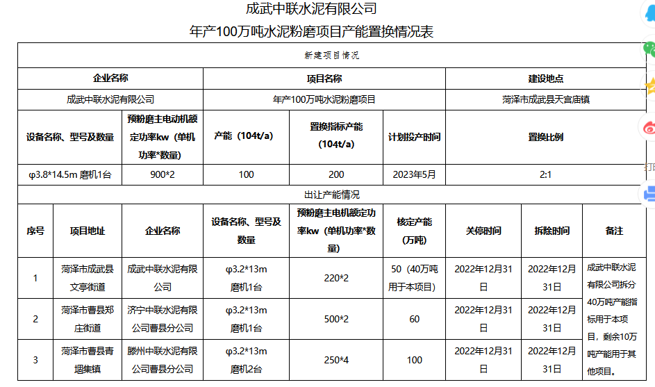 2022年10月19日公告的成武中联水泥年产100万吨产线产能置换项目,中联集团决定不再实施。中联集团拟将该方案中滕州中联曹县分公司100万吨产能指标,调配用于鲁南中联新建年产130万吨水泥粉磨项目。