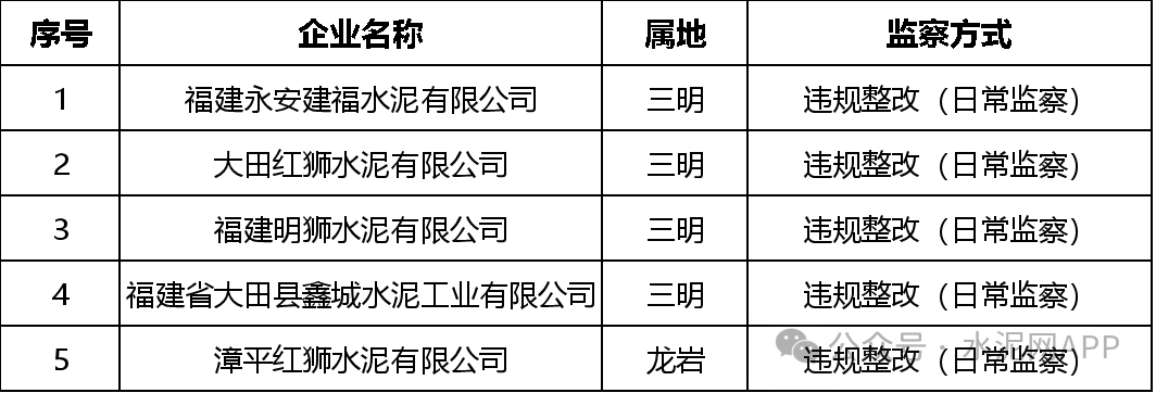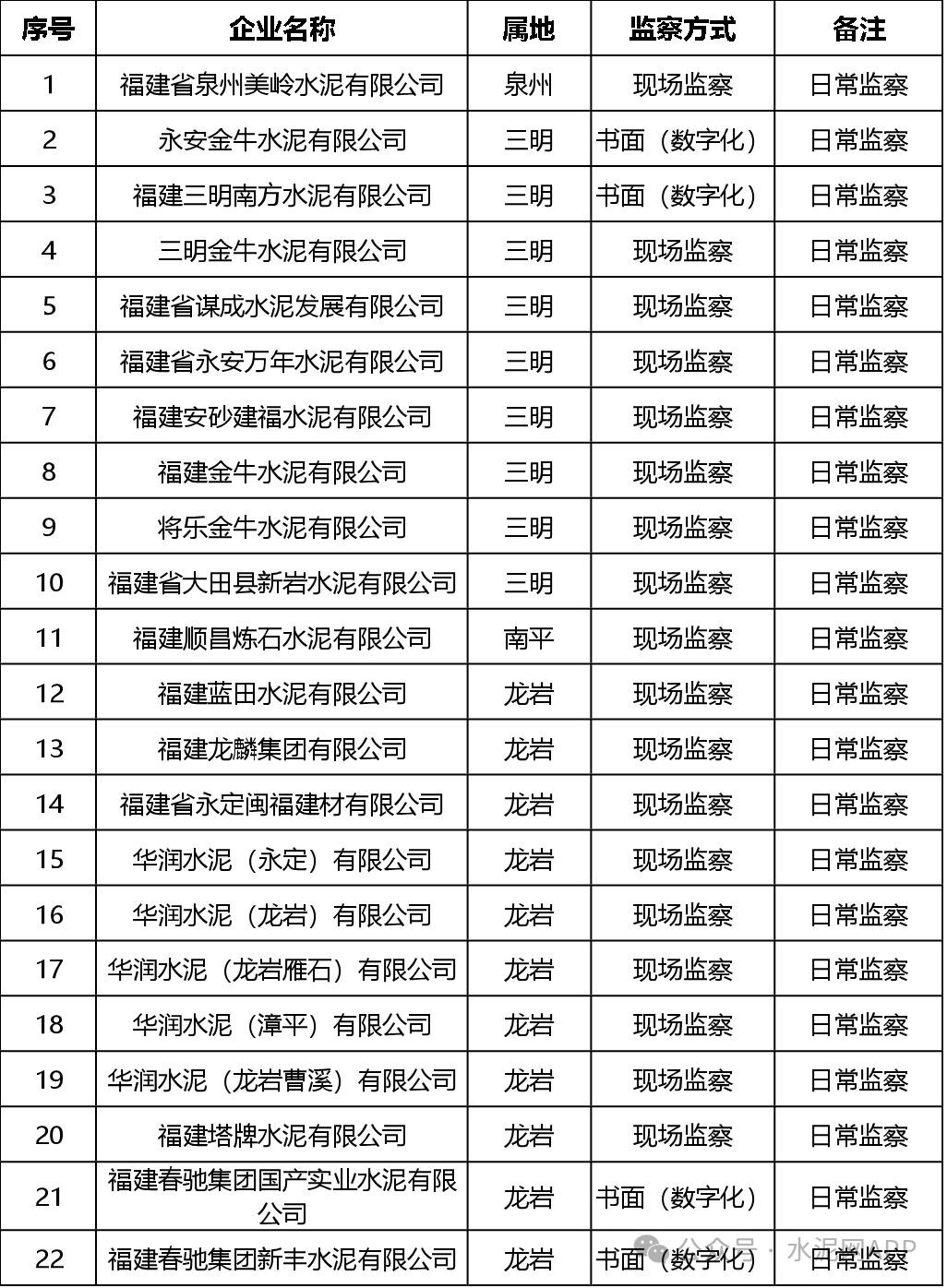 2025年福建省计划开展重点用能企业工业节能监察318家,其中省级监察企业123家,市级监察企业195家,采取现场监察与书面(数字化)监察结合的方式开展。其中水泥企业监察名单整理如下: