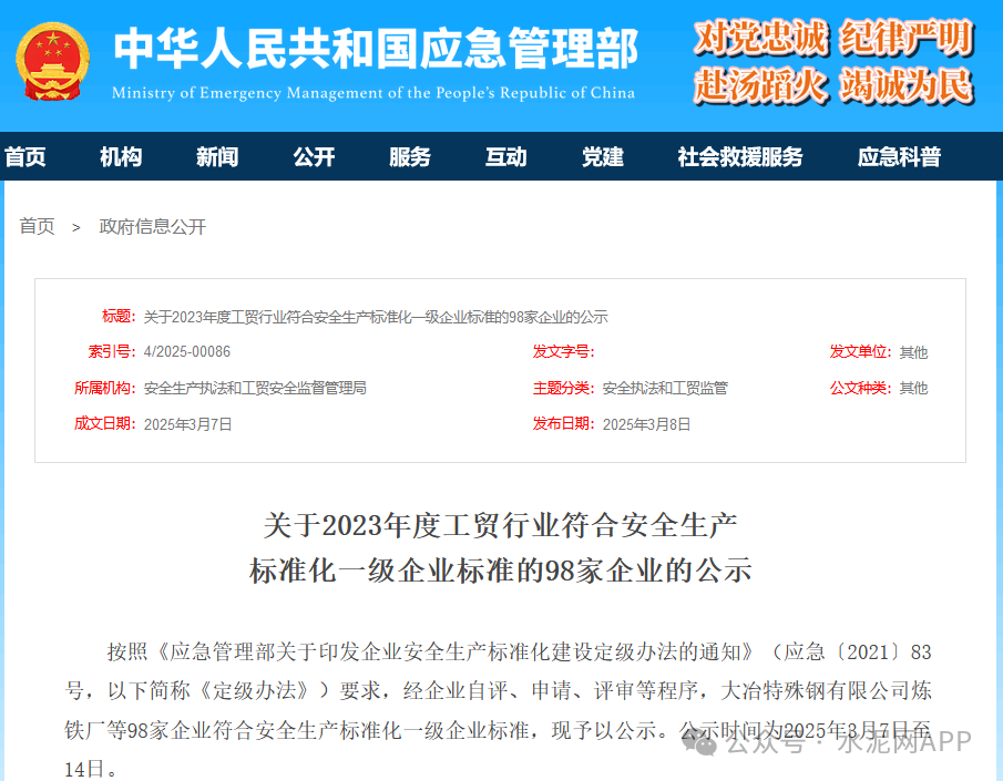 近日,国家应急管理部发布关于2023年度工贸行业符合安全生产标准化一级企业标准的98家企业的公示。