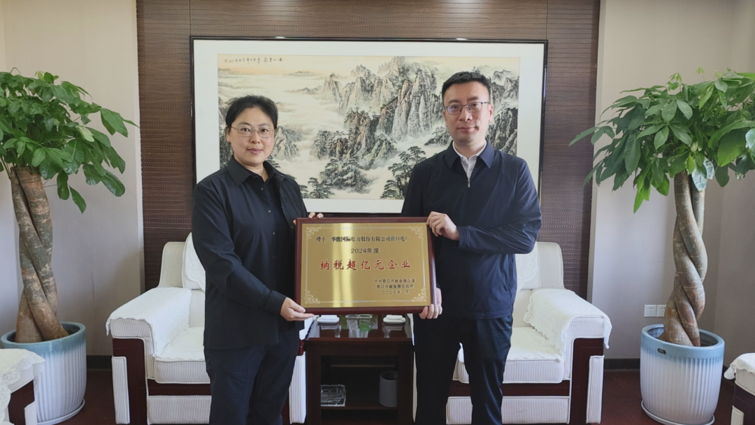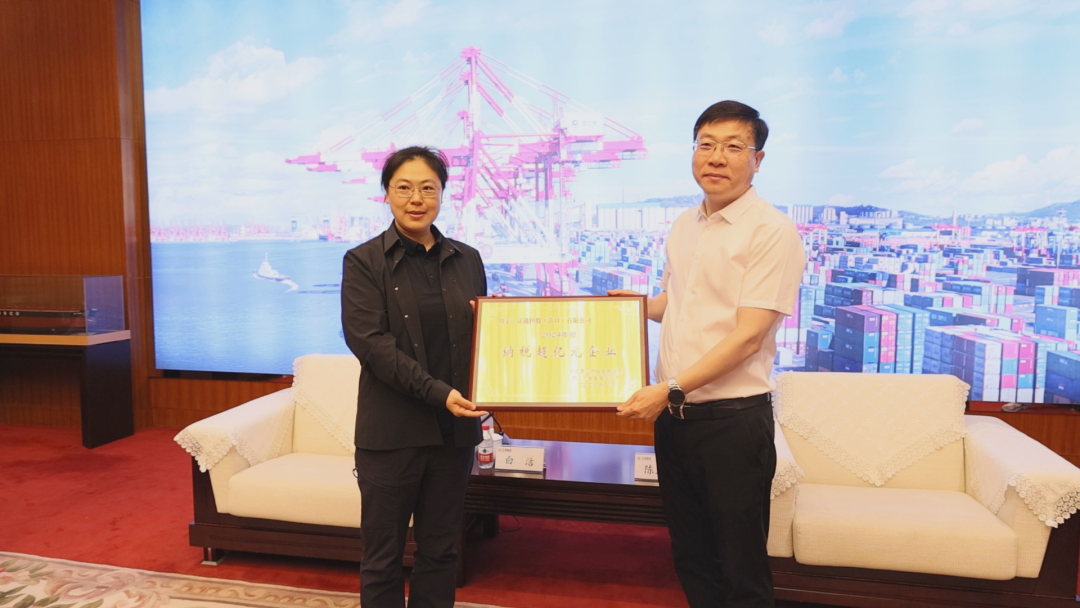白洁代表区政府向营口港务集团、华能营口电厂颁发“2024年度纳税超亿元企业”牌匾,表彰两家企业对区域经济发展所作的重要贡献。