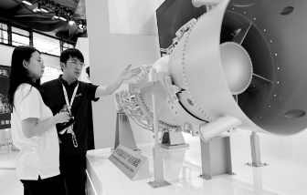6月5日,以“走向碳中和之路”为主题的2025上海国际碳中和技术、产品与成果博览会在上海新国际博览中心开幕。本届博览会围绕“应用驱动绿色转型”,由主题展览、系列论坛、贸易对接三大板块构成,来自德国、荷兰、日本、英国等15个国家和地区的逾300家行业企业全方位展示全球碳中和领域的前沿成果与实践。图为工作人员(右)在一个重型掺氢燃气轮机模型旁向参观者做介绍。