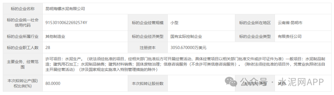 据某产权交易平台显示,近日昆明海螺水泥有限公司80%股权及19,503万元债权转让预公告发布。该企业由海螺水泥持股80%,德宏发展持股20%。