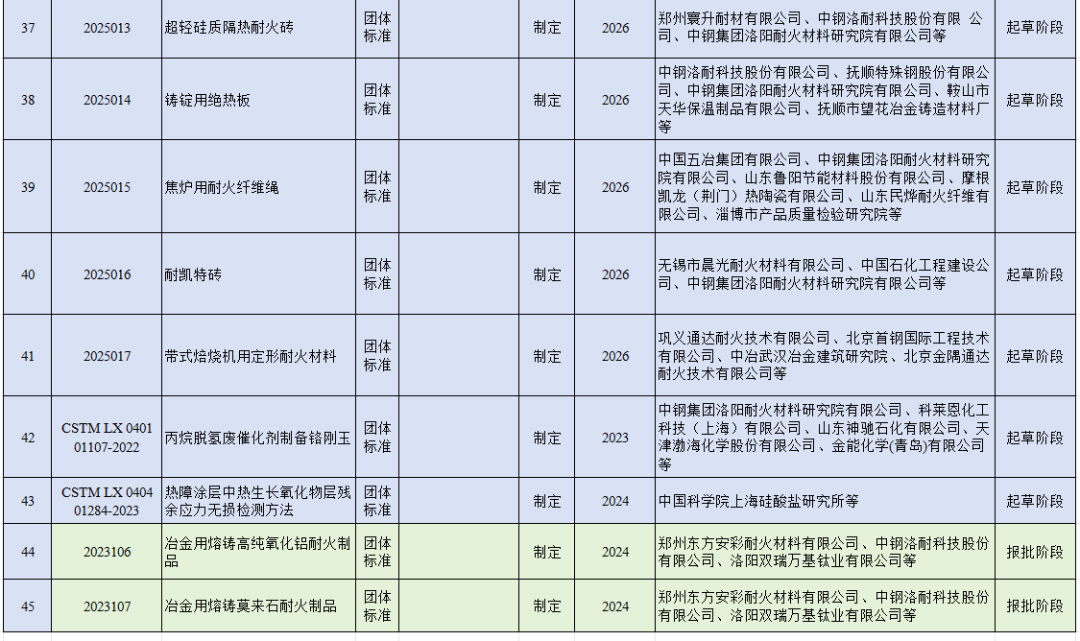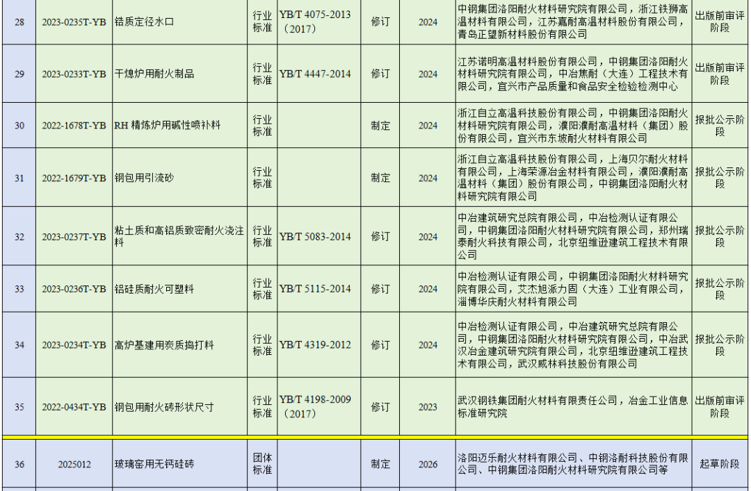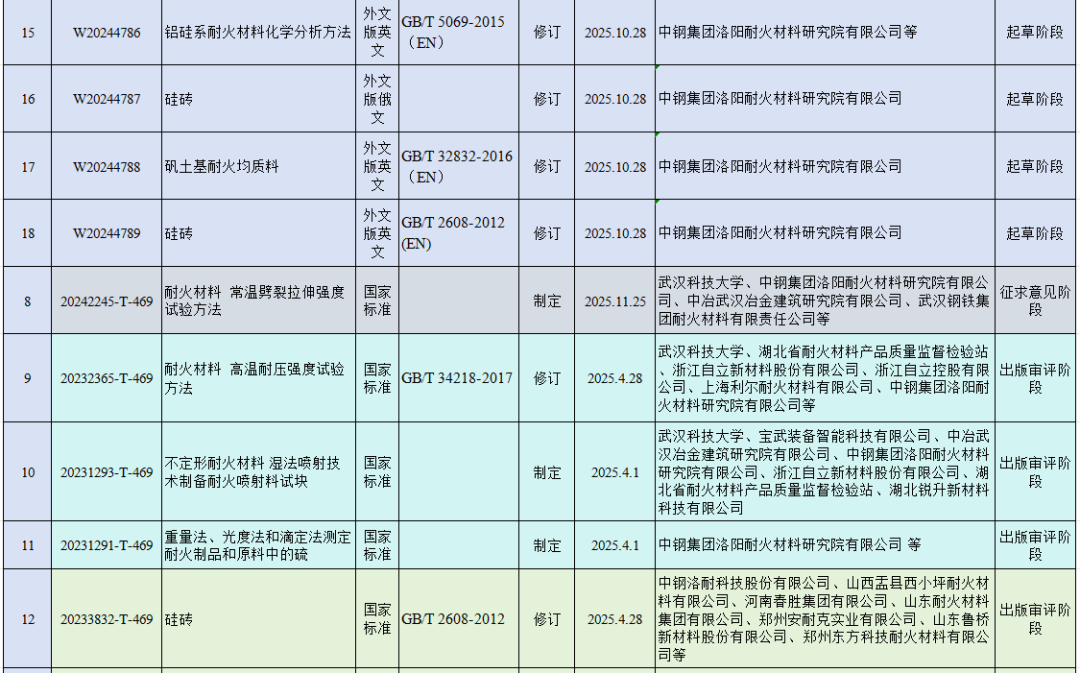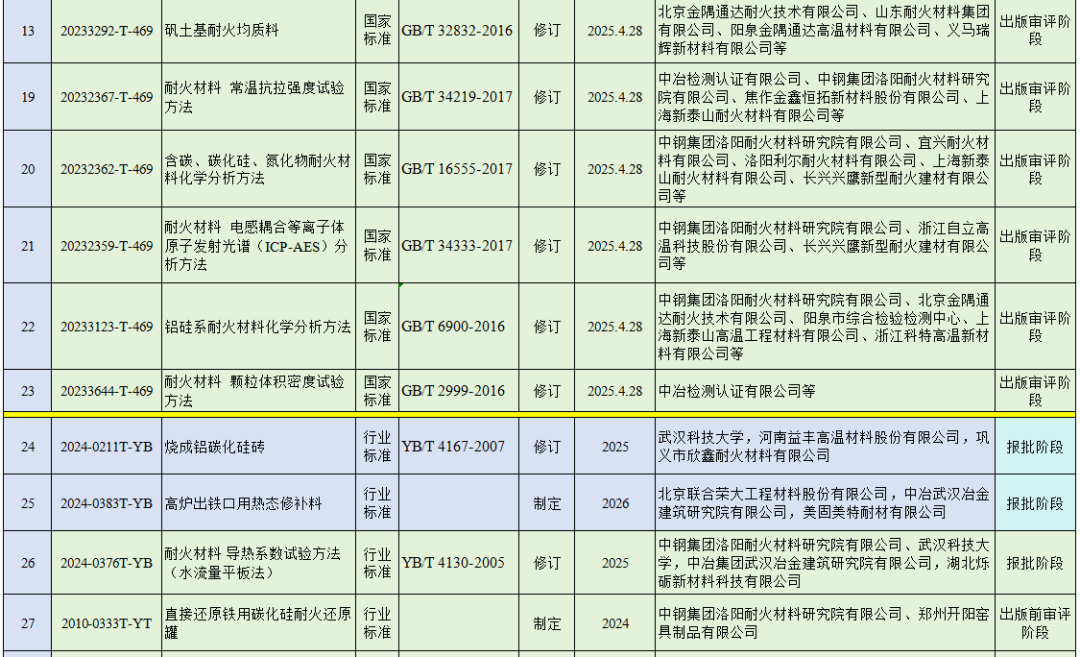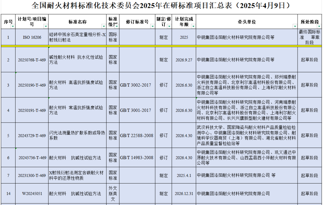 全国耐火材料标准化技术委员会2025年在研标准项目汇总表(2025年4月9日)