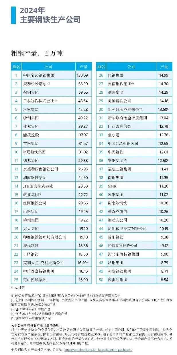 宝武、鞍钢、河钢、沙钢、建龙、首钢位列前十,2024年全球50大钢企产量排行榜出炉!