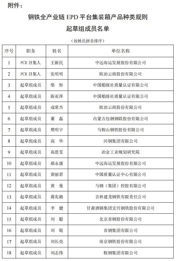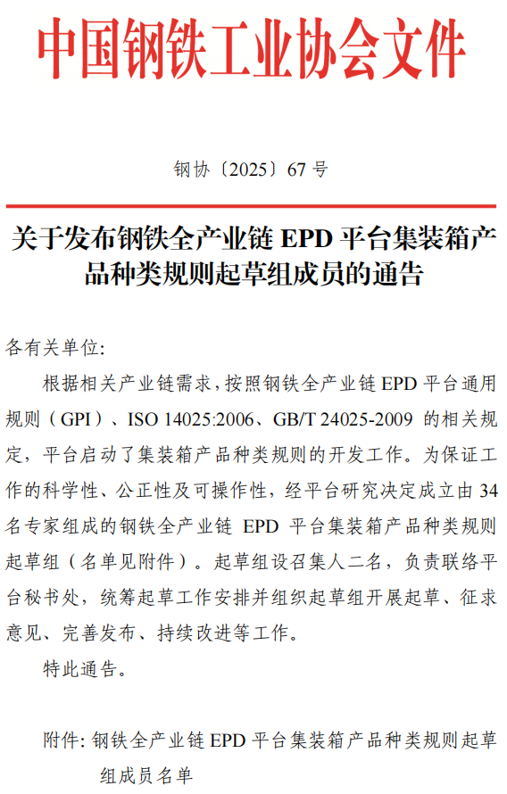 关于发布钢铁全产业链EPD平台集装箱产品种类规则起草组成员的通告