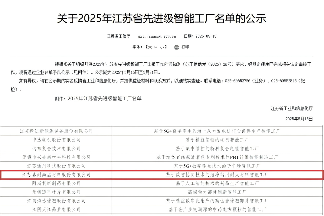 近日,江苏省工业和信息化厅公布2025年先进级智能工厂名单,江苏嘉耐高温材料股份有限公司依托“基于数智协同技术的洁净钢用耐火材料智能工厂”成功入选“江苏省先进级智能工厂”名单↓