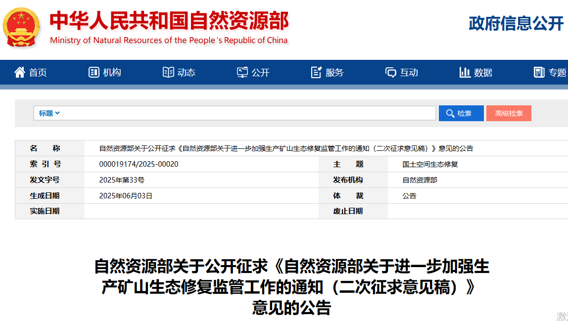 为贯彻落实新修订的《矿产资源法》和《土地管理法》《土地复垦条例》等法律法规,学习运用习近平生态文明思想“厦门实践”经验,压实采矿权人生态保护修复主体责任,推动落实“边开采、边修复”要求,促进资源开发与生态环境保护相协调,助力矿业绿色低碳发展,自然资源部在征求各方意见的基础上,起草形成《自然资源部关于进一步加强生产矿山生态修复监管工作的通知(二征求意见稿)》,现再次向社会公开征求意见。征求意见截止时间为公告发布后15日。有关意见建议可通过以下两种方式反馈: