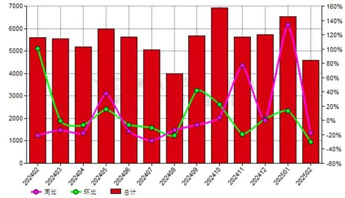 2025年2月份美国石墨粉进口量4,589.76公吨,去年同期为5,593.07公吨,上月为6,525.39公吨,同比下滑17.94%,环比下滑29.66%。