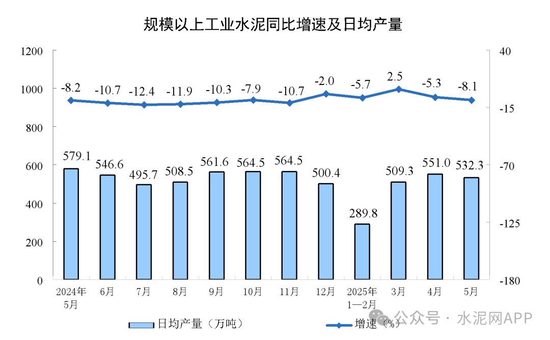 6月16日,国家统计局公布了5月份国民经济相关数据。5月份,规模以上工业增加值同比实际增长5.8%(增加值增速均为扣除价格因素的实际增长率)。从环比看,5月份,规模以上工业增加值比上月增长0.61%。1—5月份,规模以上工业增加值同比增长6.3%。其中5月份水泥产量16500万吨,同比下降8.1%;1-5月份水泥产量65939万吨,同比下降4%。此外,数据显示,2024年1-5月全国水泥产量为68727万吨,由此计算,今年1-5月水泥全口径产量比去年同期减少2788万吨,降幅4.06%。