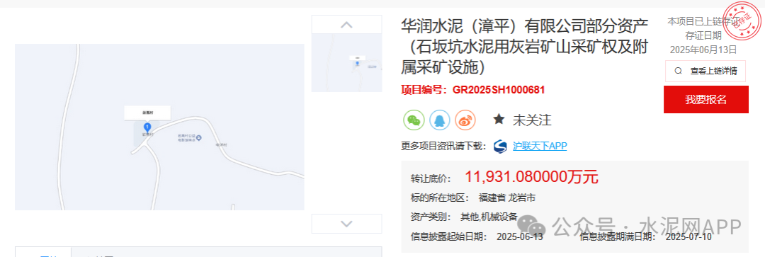 据某产权交易平台显示,近日,华润水泥(漳平)有限公司部分资产(石坂坑水泥用灰岩矿山采矿权及附属采矿设施)挂牌转让,转让底价为11931.08万元。