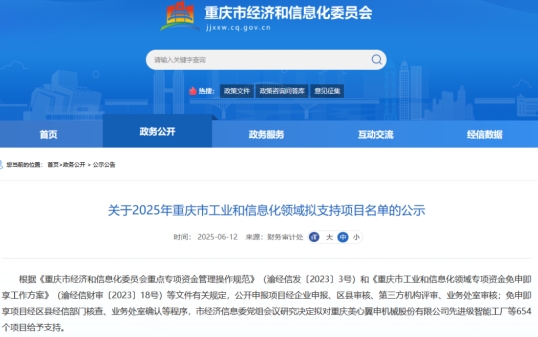 6月12日,重庆市经济和信息化委员会发布“关于2025年重庆市工业和信息化领域拟支持项目名单的公示”。