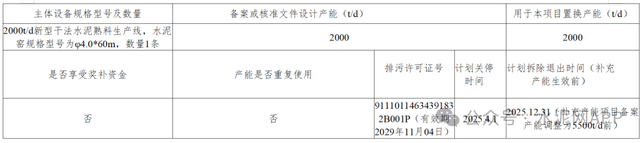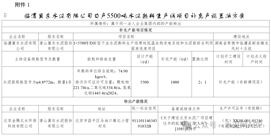 公示显示,临澧冀东水泥有限公司5500t/d新型干法水泥熟料生产线带纯低温余热发电系统和水泥窑综合利用固废危废项目补充产能1000t/d;出让产能来自北京金隅北水环保科技有限公司2000t/d水泥熟料生产线,置换比例2:1。