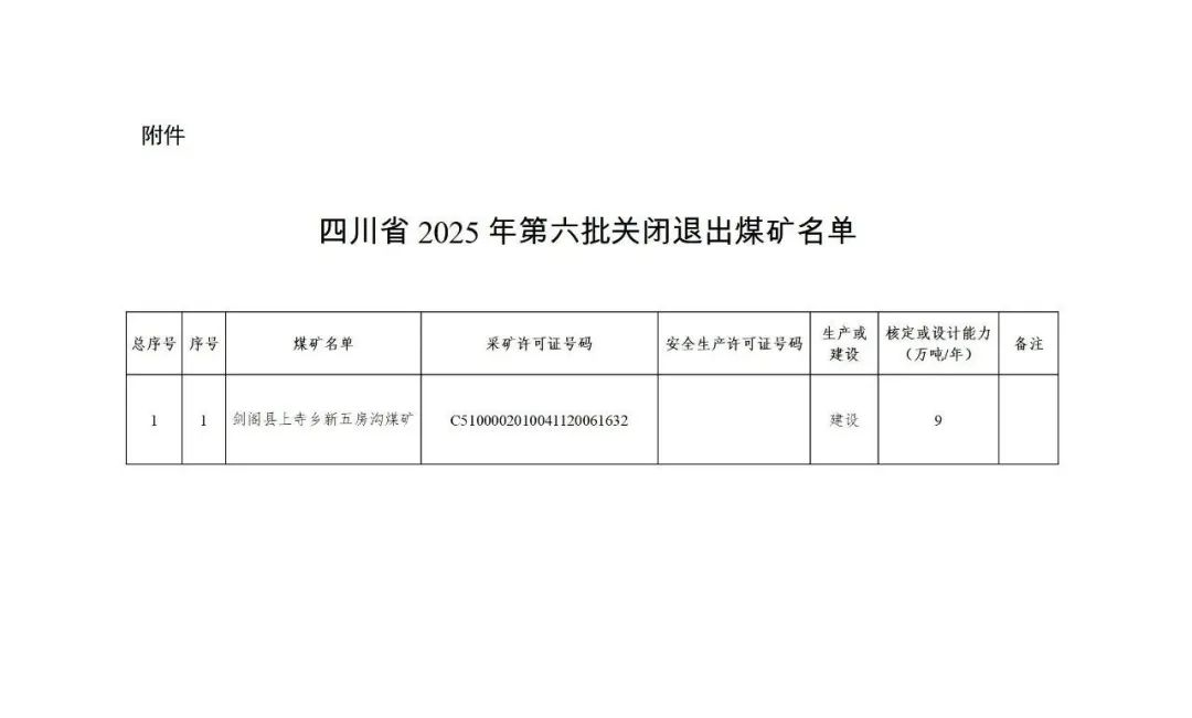 四川省安全生产委员会办公室关于2025年第六批关闭退出煤矿名单公示