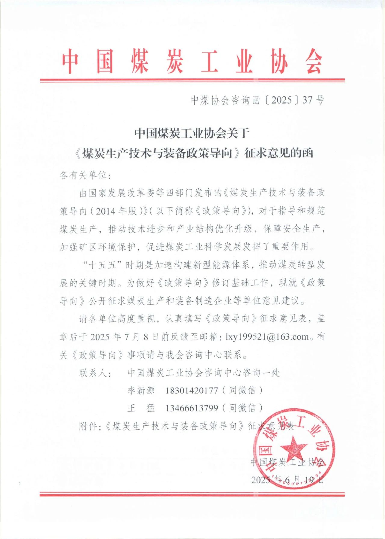 中国煤炭工业协会关于《煤炭生产技术与装备政策导向》征求意见的函