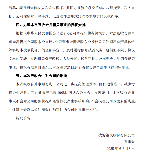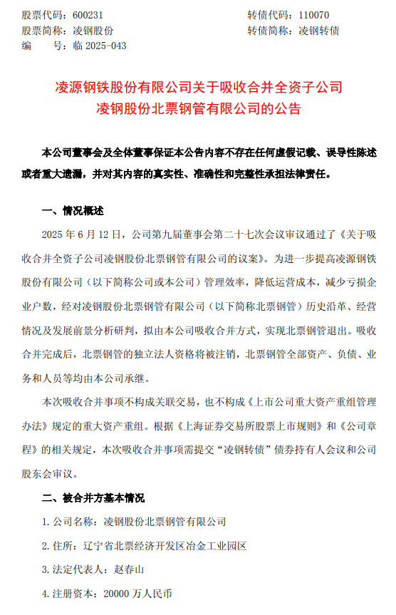 6月13日,凌钢股份发布了《凌源钢铁股份有限公司关于吸收合并全资子公司凌钢股份北票钢管有限公司的公告》(以下简称《公告》)。