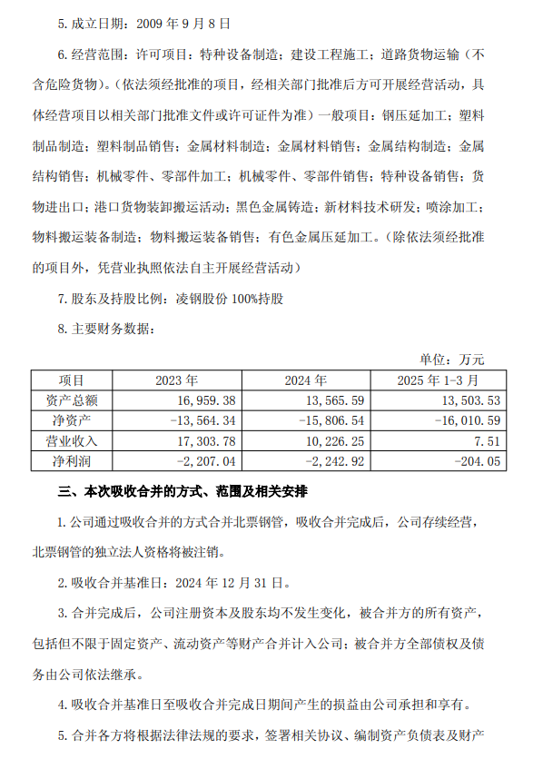 从《公告》中获悉,为进一步提高凌源钢铁股份有限公司(以下简称公司或本公司)管理效率,降低运营成本,减少亏损企业户数,经对凌钢股份北票钢管有限公司(以下简称北票钢管)历史沿革、经营情况及发展前景分析研判,拟由本公司吸收合并方式,实现北票钢管退出。吸收合并完成后,北票钢管的独立法人资格将被注销,北票钢管全部资产、负债、业务和人员等均由本公司承继。