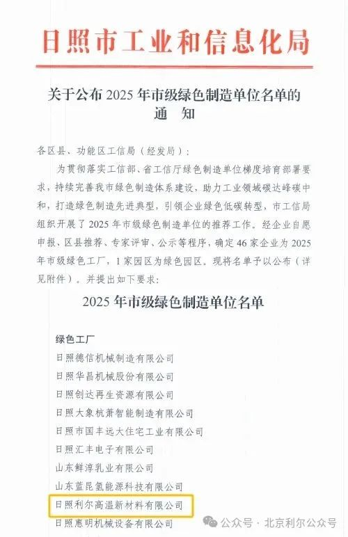近日,日照市工业和信息化局公布了2025年市级绿色制造单位,日照利尔高温新材料有限公司被评为绿色工厂。