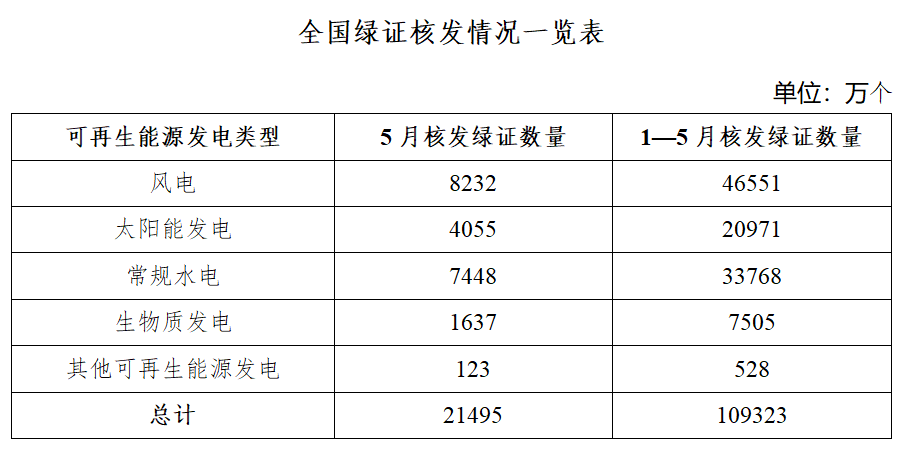 2025年5月,国家能源局核发绿证2.15亿个,环比下降0.59%,涉及可再生能源发电项目12.71万个,其中可交易绿证1.30亿个,占比60.31%;本期核发2025年4月可再生能源电量对应绿证1.57亿个,占比73.20%。2025年1-5月,国家能源局共计核发绿证10.93亿个,其中可交易绿证7.62亿个。