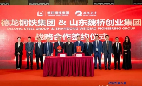 06月26日上午,德龙钢铁集团与山东魏桥创业集团在天津举行战略合作框架协议签约仪式。在天津市钢铁工业协会秘书长杨勇、副秘书长时东生及现场百余位嘉宾的共同见证下,德龙钢铁集团营销中心总经理李君亮、宏桥国际贸易有限公司总经理刘健康分别代表双方签约。