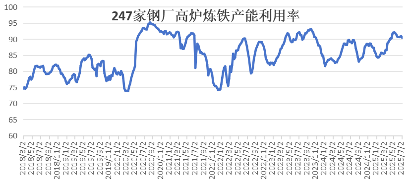 目前样本钢企高炉炼铁产能利用率90.29%,环比减少0.54%,日均铁水产量240.85万吨,环比减少1.44万吨,产量虽然下浮下降,但依旧维持在240+的相对高位水平,对原材料的需求仍存。