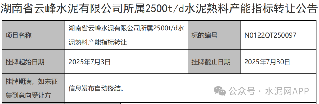 近日,湖南省云峰水泥有限公司(海螺水泥持股65%)所属2500t/d水泥熟料产能指标转让,底价为4575万元。