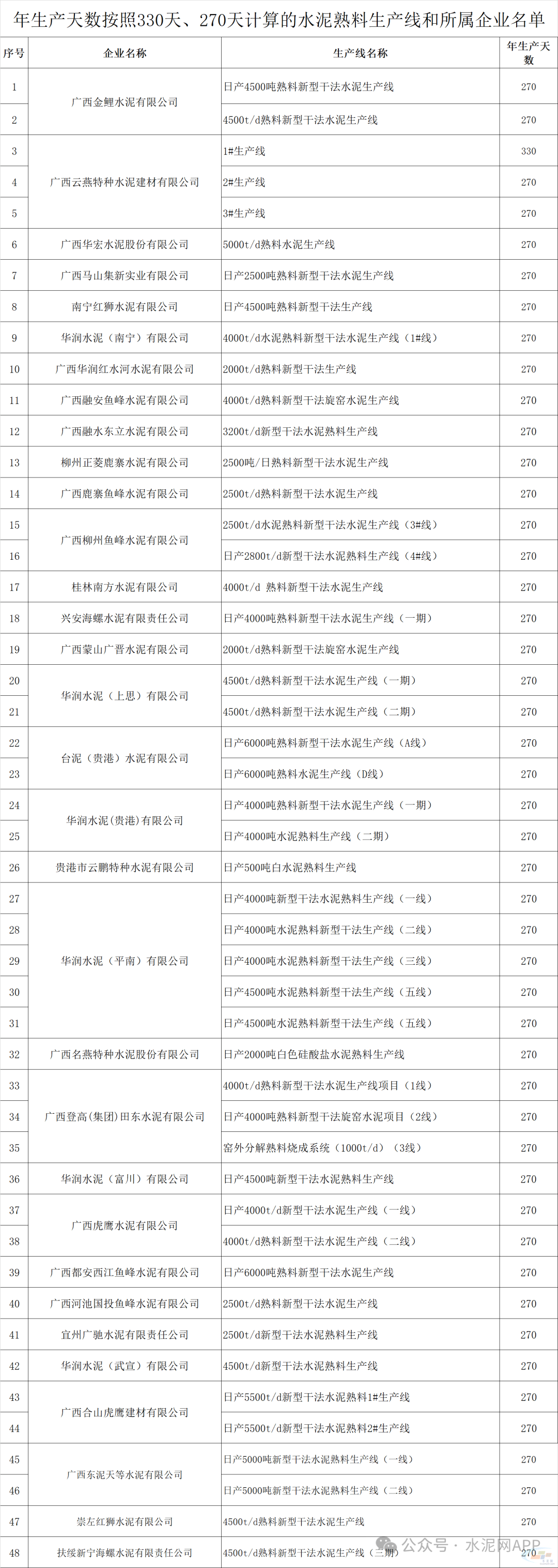 近日,广西壮族自治区工业和信息化厅发布《关于年生产天数按照330天、270天计算的水泥熟料生产线名单的公示》。根据公示,广西壮族自治区按照330天、270天计算的水泥熟料生产线和所属企业名单中共计48条水泥熟料生产线,其中,广西云燕特种水泥建材有限公司1#生产线年生产天数按照330天计算,其余47条水泥熟料生产线年生产天数按照270天计算。