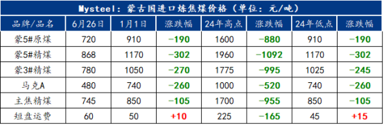 国内双焦市场弱势运行,进口蒙古国炼焦煤随之下跌,口岸各煤种销售价格从年初高位逐月下滑,现已接近贸易企业成本线,但短盘运费、监管区仓储等固定成本费用变化不大,口岸贸易企业利润空间不断受到挤压。部分企业近期暂停拉运,转向消化监管区现有库存,等待三季度市场行情。截止6月26日甘其毛都口岸蒙5#原煤口岸提货含税价720元/吨,环比年初下跌190元/吨;蒙5#精煤乌不浪口金泉工业园区含税价868元/吨,环比年初下跌302元/吨;甘其毛都口岸蒙3#精煤口岸提货含税价780元/吨,环比年初下跌270元/吨;策克口岸马克A原煤含税价480元/吨,环比年初下跌260元/吨;满都拉主焦精煤含税价745元/吨,环比年初下跌105元/吨。但与之对应的甘其毛都口岸短盘运费60元/吨,环比年初上涨10元/吨。