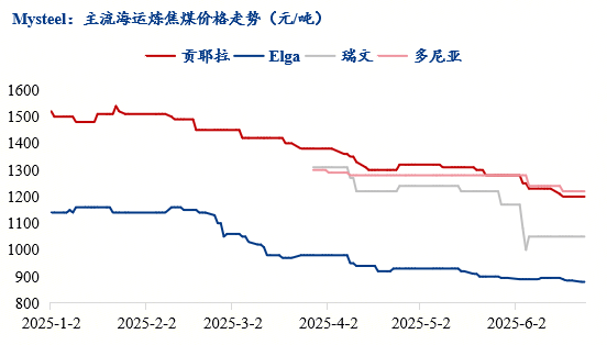 海运炼焦煤价格在我国的现货价格,今年以来重心整体下移。俄焦煤因整体货量较大,叠加品质相对其他煤种较差,价格向下幅度更加明显。澳煤、加煤价格因前期采购成本支撑,贸易出货环节虽然大幅度下调报价,但是实盘成交情绪依旧相对冷清。同时,整体国内港口现货价格与国际市场价格也形成较大劈叉,导致矿山对国内市场销货信心受损,且销售策略有所调整。而印度市场作为主要国际买方,近期其国内炼焦煤港口库存上涨较快,对高价资源接受度也有所下降,但是国际价格高位仍受多种因素制约,短期国内外价差仍难修复。后续下半年国内价格重心在基本面没有明显优化的状态下,仍有下移的预期。