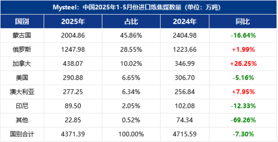 据海关总署最新数据显示,截止5月底,2025年中国进口量炼焦煤总计4371.39万吨,同比下降7.3%。其中,蒙古国作为我国进口煤的主要来源国,减量尤为明显,年同比下降16.64%(-400.12万吨)。2025年初三大口岸过货量目标增长至8100万吨,较2024年过货量目标增长15.71%,较2024年实际完成过货量增长8.0%。过货目标增加导致口岸监管区周转压力明显,库存持续高位,1月底至4月底连续三个月库存在400万吨以上,最高值超460万吨,超出核定库容32%。监管区周转压力导致通关过货不增反降,6月底甘其毛都口岸监管区库存再度突破至410万吨附近,贸易企业拉运积极性不足,下半年蒙煤供应难有大幅增长。根据Mysteel数据,截止2025年5月底进口焦煤总量达到4371.39万吨左右,其中海运炼焦煤进口2366.53万吨,年同比微增2.42%左右,其中俄煤占据海运炼焦煤总量的52.73%。美国焦煤进口量第一季度并未显示出颓势,主要还是由于前期抢进口及国内进口关税的灵活期导致到港量维持相对高位,但是到二季度进口量开始下行。而我国国内贸易环节认为美国焦煤进口在28%的进口关税水平下仍然难改进口颓势,在5月份进口量归零。澳大利亚、加拿大的进口焦煤资源也因为中国一直为其机会市场,并没有大范围向我国发运,虽然加拿大、澳大利亚焦煤同比增加26.25%、7.95%,但是此两者未能有效弥补美国焦煤进口暂歇形成的缺口。而从进口海运焦煤到港情况可以看出,俄罗斯主流矿山增加对我国国内长协供应,4-5月其已经重新回到海运焦煤到港量的头部位置,每周到港量达到40-50万吨左右。加拿大及澳大利亚焦煤资源到港波动性更强,源于国内贸易及终端定期采买量有限、其矿山事故停产、且受到船运周期较长等因素影响到港。综合全年来看,2025年中国进口炼焦煤总量或为1.05亿吨,同比减少1600万吨左右。