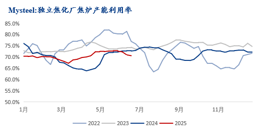 上半年炼焦煤需求维持相对高位,但显性补库需求较弱,下游炼焦煤持续去库趋势,始终保持低库存采购策略。原料煤价格持续让利下,焦企仍保持高位生产。2025上半年Mysteel全国独立焦企开工率73.42%同比增3.9%,增幅较为明显Mysteel钢厂焦企开工86.9%同比下移0.21%,弱稳运行。从独立焦企看,上半年独立焦企开工较为平稳保持小幅上升趋势,华北焦企用煤消耗高于去年同期水平,华东以及东北区域焦企开工率低于去年同期,叠加区域性用煤结构或有差异,华北焦企库存普遍低于去年同期水平。钢厂焦企原料煤库存相对平稳,生产节奏较为稳定。上半年用煤消耗不减,低库存采购仍能平衡生产端,中间环节需求量流动下较差,上半年炼焦煤需求对价格难有明显驱动。下半年炼焦煤市场核心矛盾是对需求考验,从宏观经济,基建房地产仍有调控优化政策出台预期,政策环境以及方向仍相对友好,其次关税贸易变化仍有具有不确定性,对市场情绪端仍有扰动。从下游需求看,钢材出口市场转弱以及叠加行政减产仍是不确定对原料仍有一定压制。从焦化厂用煤采购看,下游仍受季节性影响,或推动结构性补库需求,当下下游库存处于绝对低位,市场价格吻合预期下,不排除会有间接性补库信号显现。下半年从焦化厂产能释放和投产看,下半年净新增产能1459万吨,主要分布山西、内蒙等区域,如按期投产对原料煤实际消耗有效果增加。从利润看需求,总体看下半年炼焦煤市场边际需求或有减弱,季度性备库需求和新增产能主导是否能够有效带动需求转化,需求的风险更多集中在下游焦企利润进一步挤兑后的主动减产力度以及钢材出口转弱风险对原料煤形成负反馈。