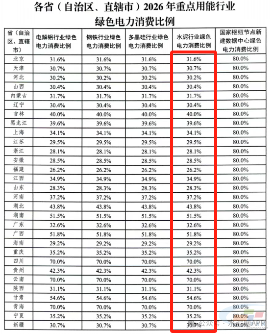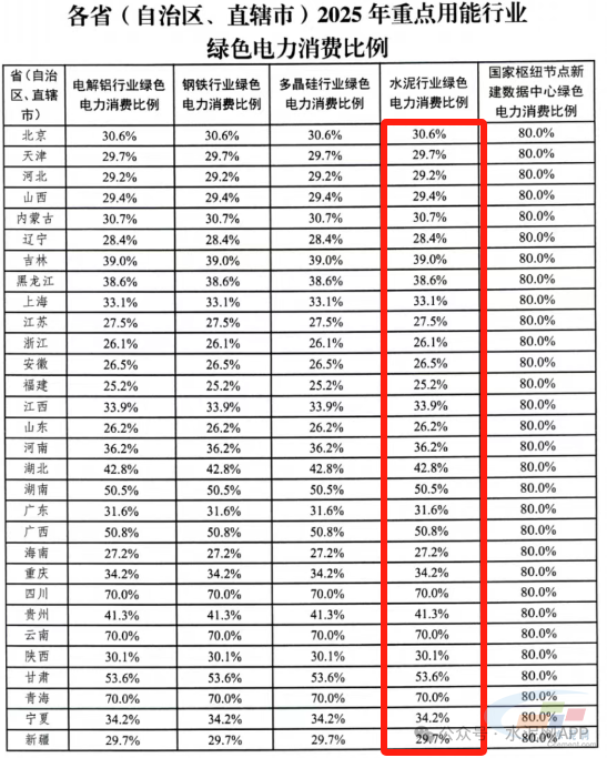 《通知》在2024年增加对电解铝行业单独的绿电消费比例的基础上,2025年增设钢铁、水泥、多晶硅行业和国家枢纽节点新建数据中心绿色电力消费比例。2025年各省水泥行业绿色电力消费比例从25.2%-70%不等。
