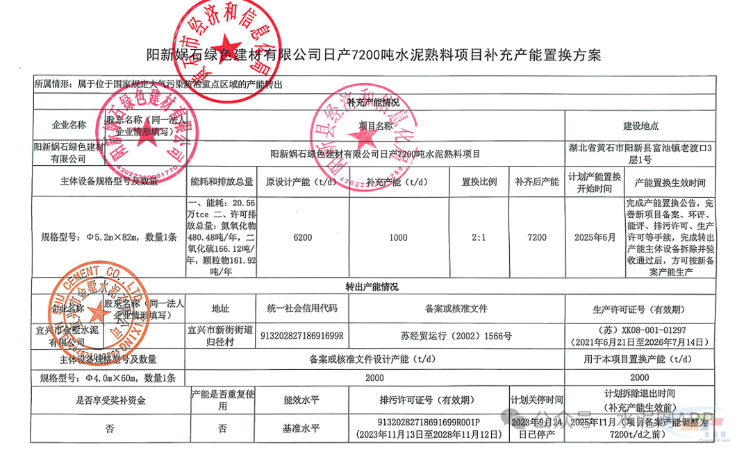 置换方案显示,阳新娲石绿色建材有限公司日产6200吨水泥熟料生产线补充产能1000t/d,补齐后产能7200t/d。退出产能来自宜兴市金墅水泥有限公司2000t/d水泥熟料生产线,置换比例为2:1。
